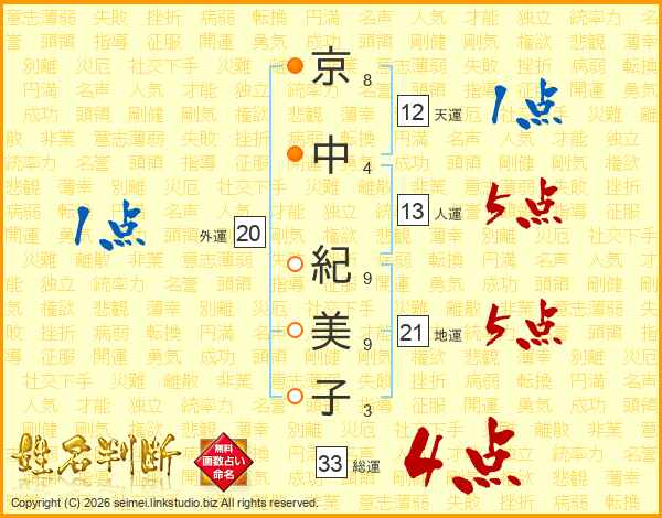 京(8画)中(4画) 紀(9画)美(9画)子(3画)