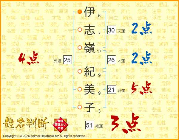 伊(6画)志(7画)嶺(17画) 紀(9画)美(9画)子(3画)