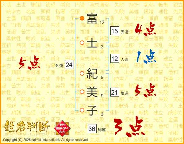 富(12画)士(3画) 紀(9画)美(9画)子(3画)