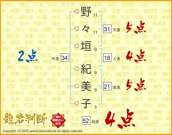 野(11画)々(11画)垣(9画) 紀(9画)美(9画)子(3画)