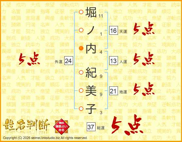 堀ノ内紀美子さんの総運は37画の5点!