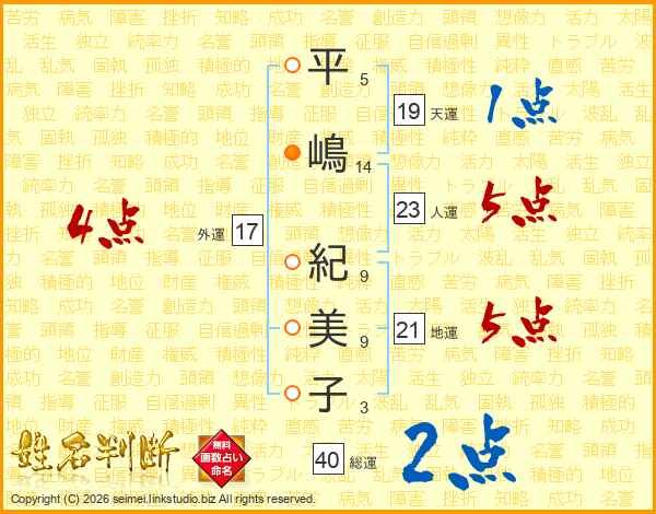 平(5画)嶋(14画) 紀(9画)美(9画)子(3画)