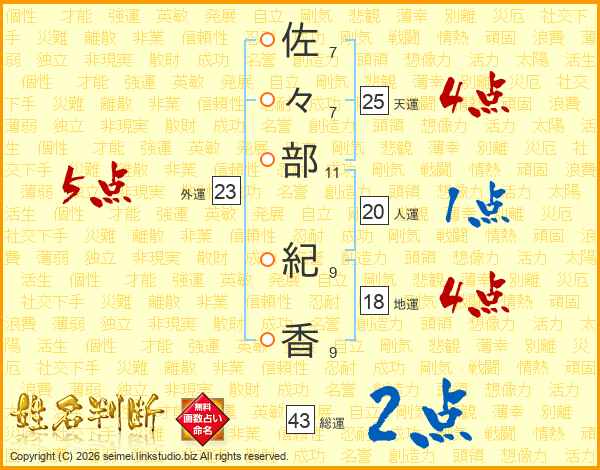 佐々部紀香さんの総運は43画の2点!