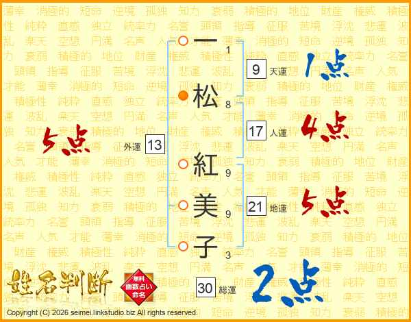 一(1画)松(8画) 紅(9画)美(9画)子(3画)