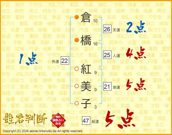 倉(10画)橋(16画) 紅(9画)美(9画)子(3画)
