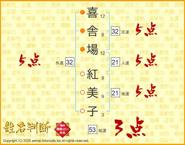喜(12画)舎(8画)場(12画) 紅(9画)美(9画)子(3画)