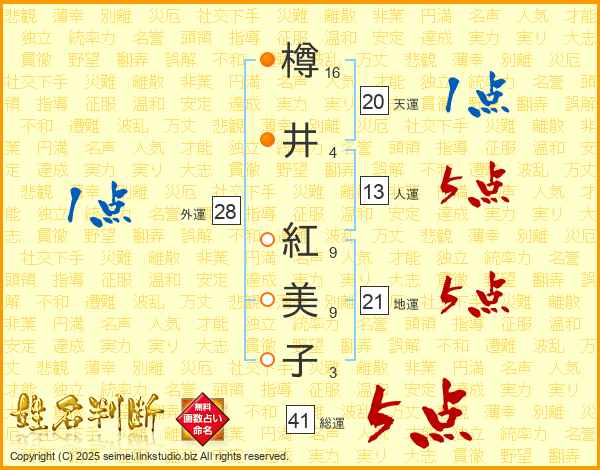 樽(16画)井(4画) 紅(9画)美(9画)子(3画)