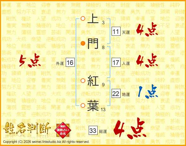生活面を象徴する運勢です。外部から受ける影響力を表し、結婚運、家庭運や職場、環境への順応性を表します。総運から人運を引いた画数。姓や名が1文字の場合を除く。