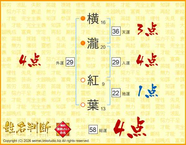 横(16画)瀧(20画) 紅(9画)葉(13画)