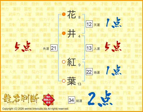 生活面を象徴する運勢です。外部から受ける影響力を表し、結婚運、家庭運や職場、環境への順応性を表します。総運から人運を引いた画数。姓や名が1文字の場合を除く。