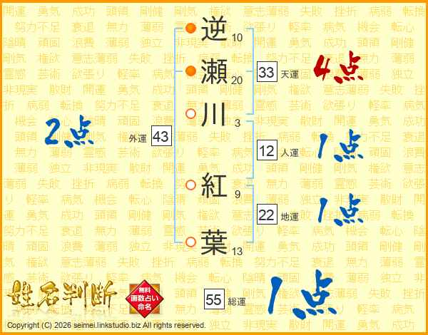 逆瀬川紅葉さんの総運は55画の1点!