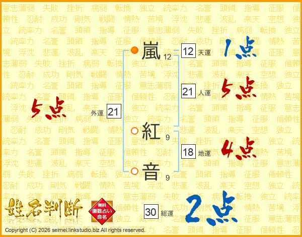 生活面を象徴する運勢です。外部から受ける影響力を表し、結婚運、家庭運や職場、環境への順応性を表します。総運から人運を引いた画数。姓や名が1文字の場合を除く。