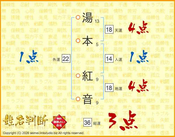 生活面を象徴する運勢です。外部から受ける影響力を表し、結婚運、家庭運や職場、環境への順応性を表します。総運から人運を引いた画数。姓や名が1文字の場合を除く。