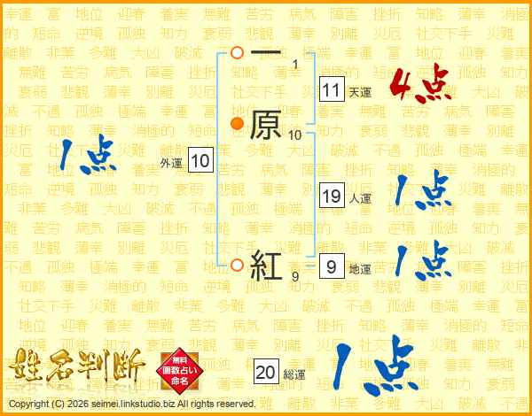 生活面を象徴する運勢です。外部から受ける影響力を表し、結婚運、家庭運や職場、環境への順応性を表します。総運から人運を引いた画数。姓や名が1文字の場合を除く。