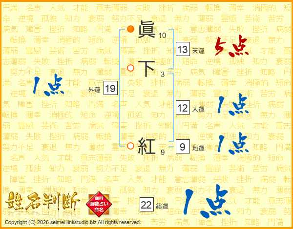 生活面を象徴する運勢です。外部から受ける影響力を表し、結婚運、家庭運や職場、環境への順応性を表します。総運から人運を引いた画数。姓や名が1文字の場合を除く。
