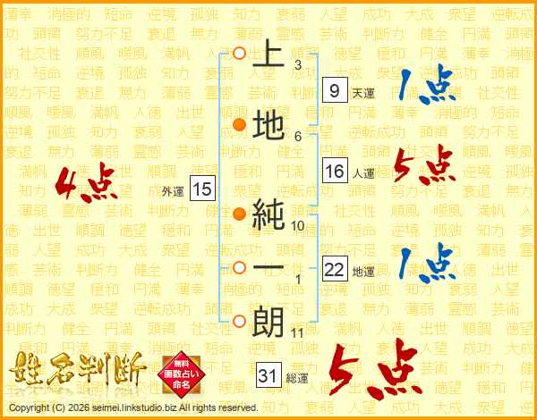 上(3画)地(6画) 純(10画)一(1画)朗(11画)