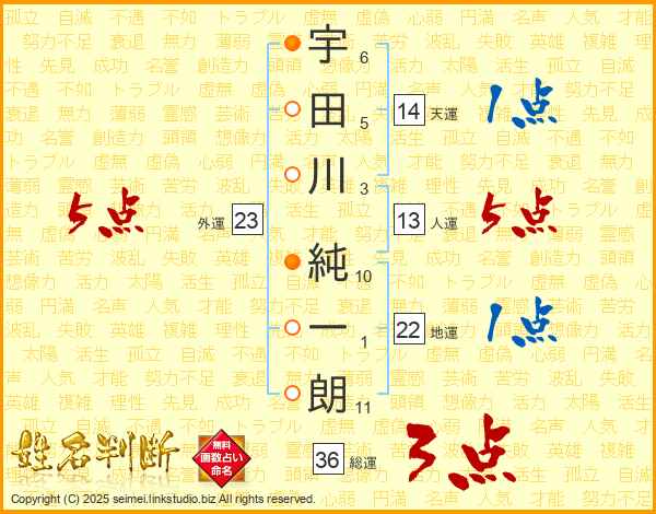 宇(6画)田(5画)川(3画) 純(10画)一(1画)朗(11画)