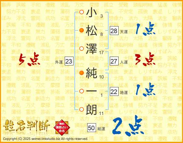 小(3画)松(8画)澤(17画) 純(10画)一(1画)朗(11画)