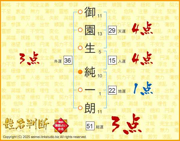 御(11画)園(13画)生(5画) 純(10画)一(1画)朗(11画)