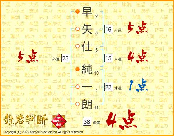 早(6画)矢(5画)仕(5画) 純(10画)一(1画)朗(11画)