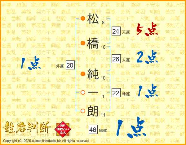 松(8画)橋(16画) 純(10画)一(1画)朗(11画)