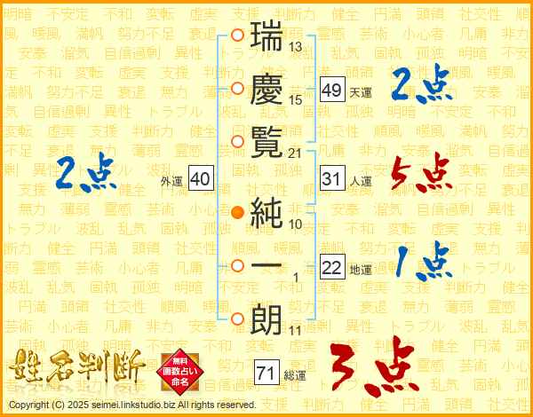 瑞(13画)慶(15画)覧(21画) 純(10画)一(1画)朗(11画)