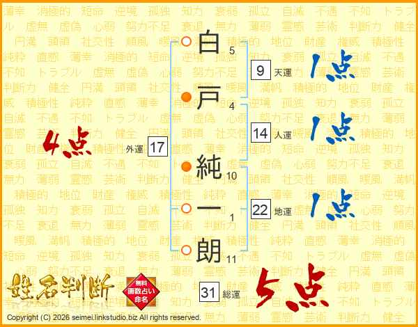 白(5画)戸(4画) 純(10画)一(1画)朗(11画)