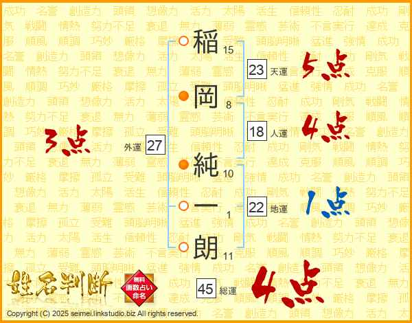 稲(15画)岡(8画) 純(10画)一(1画)朗(11画)