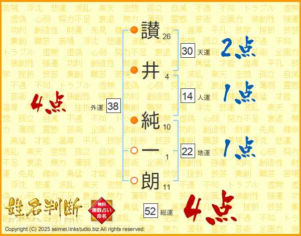 讃(26画)井(4画) 純(10画)一(1画)朗(11画)