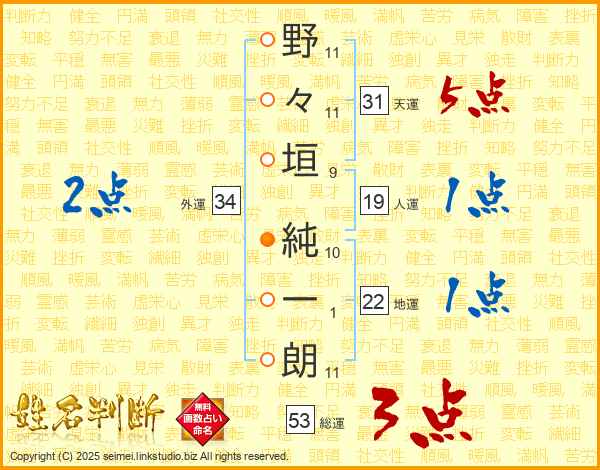 野(11画)々(11画)垣(9画) 純(10画)一(1画)朗(11画)