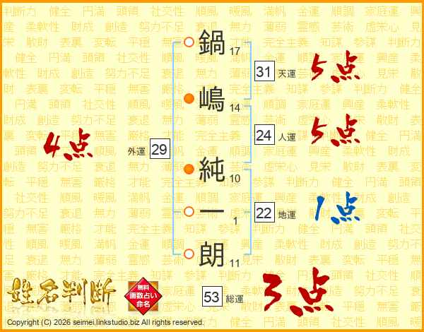 鍋(17画)嶋(14画) 純(10画)一(1画)朗(11画)