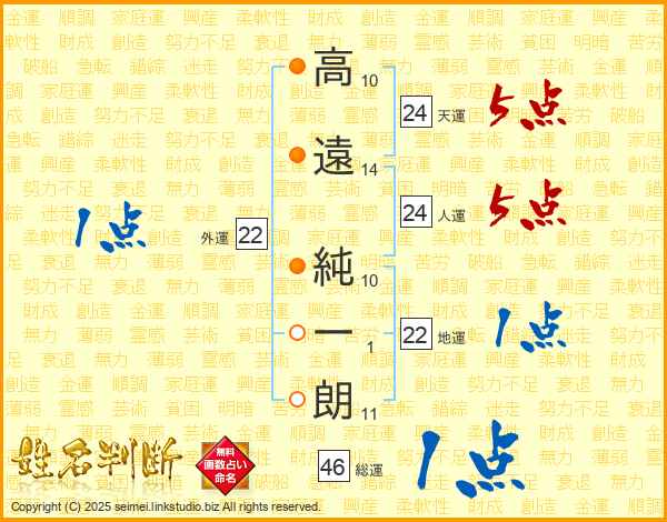 高(10画)遠(14画) 純(10画)一(1画)朗(11画)