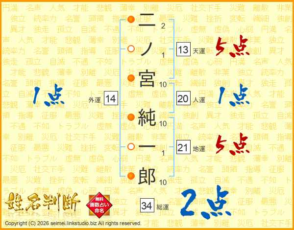 二(2画)ノ(1画)宮(10画) 純(10画)一(1画)郎(10画)