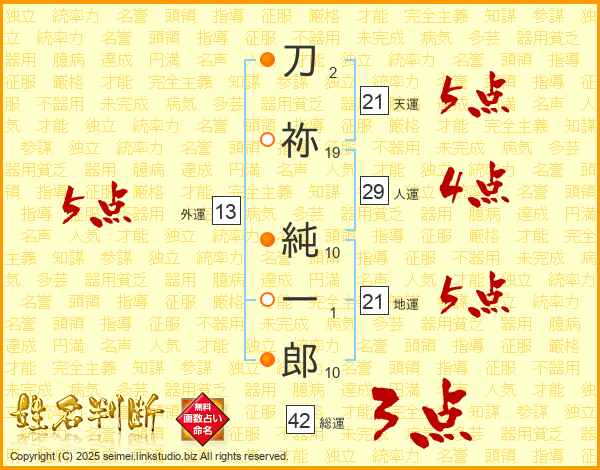 刀(2画)祢(19画) 純(10画)一(1画)郎(10画)