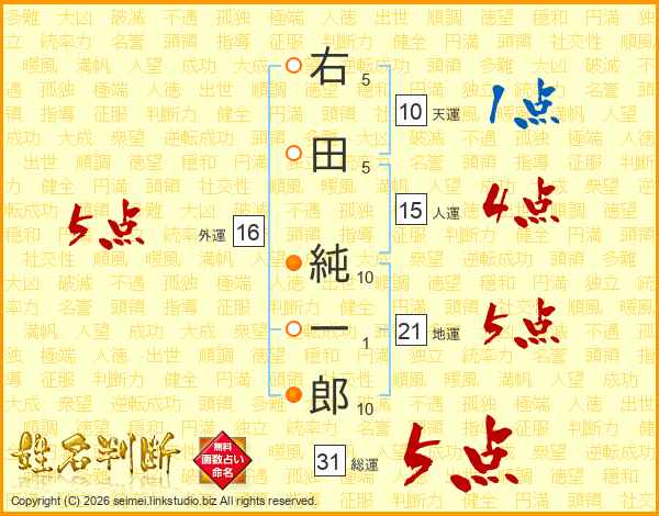 右(5画)田(5画) 純(10画)一(1画)郎(10画)