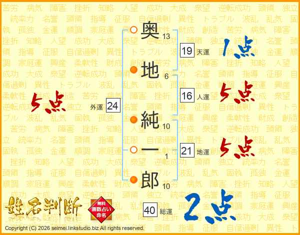奥(13画)地(6画) 純(10画)一(1画)郎(10画)