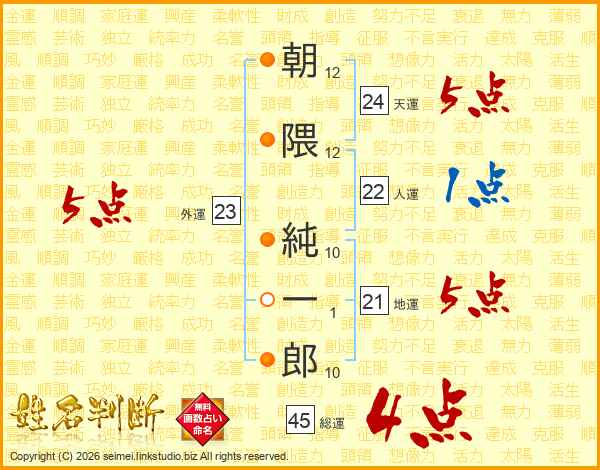 朝(12画)隈(12画) 純(10画)一(1画)郎(10画)