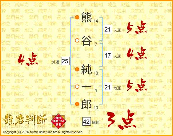熊(14画)谷(7画) 純(10画)一(1画)郎(10画)