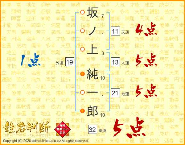 坂(7画)ノ(1画)上(3画) 純(10画)一(1画)郎(10画)