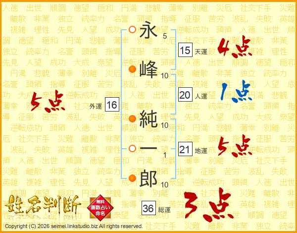 永(5画)峰(10画) 純(10画)一(1画)郎(10画)