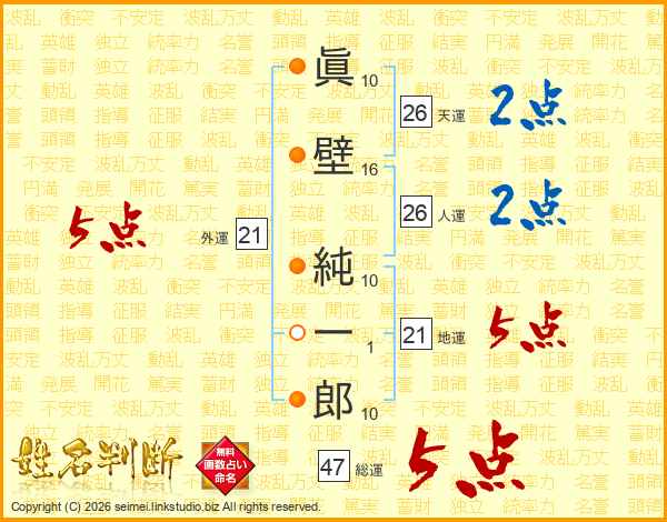眞(10画)壁(16画) 純(10画)一(1画)郎(10画)