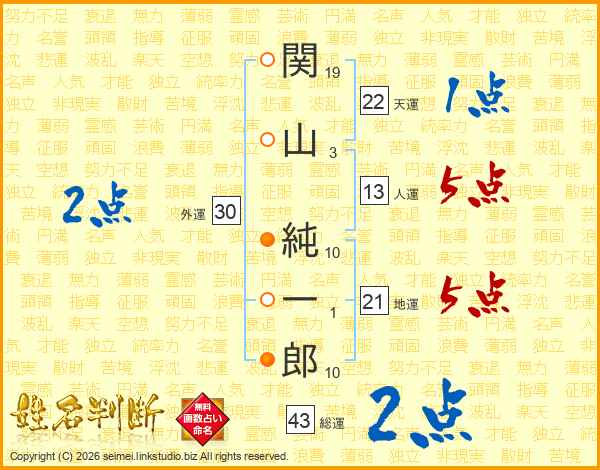 関(19画)山(3画) 純(10画)一(1画)郎(10画)