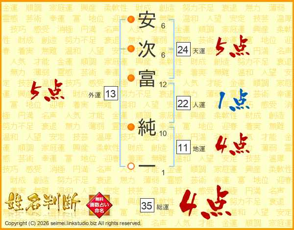 安(6画)次(6画)富(12画) 純(10画)一(1画)