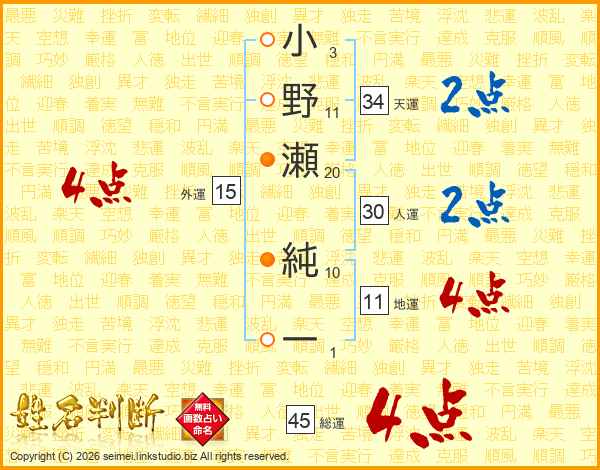 小(3画)野(11画)瀬(20画) 純(10画)一(1画)