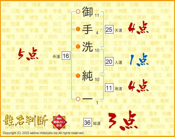 御(11画)手(4画)洗(10画) 純(10画)一(1画)