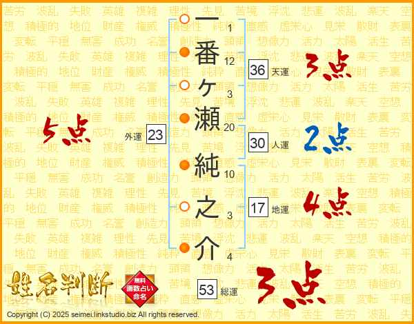 一番ヶ瀬純之介さんの総運は53画の3点!