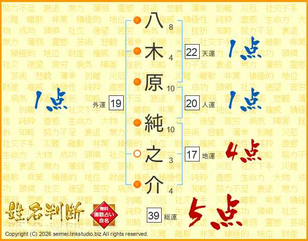 八木原純之介さんの総運は39画の5点!
