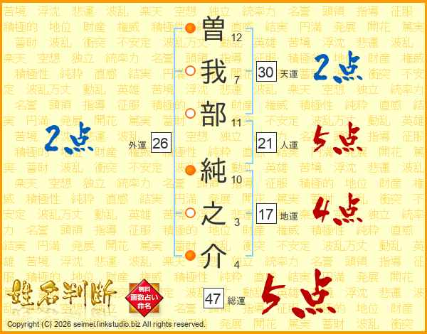 曽(12画)我(7画)部(11画) 純(10画)之(3画)介(4画)