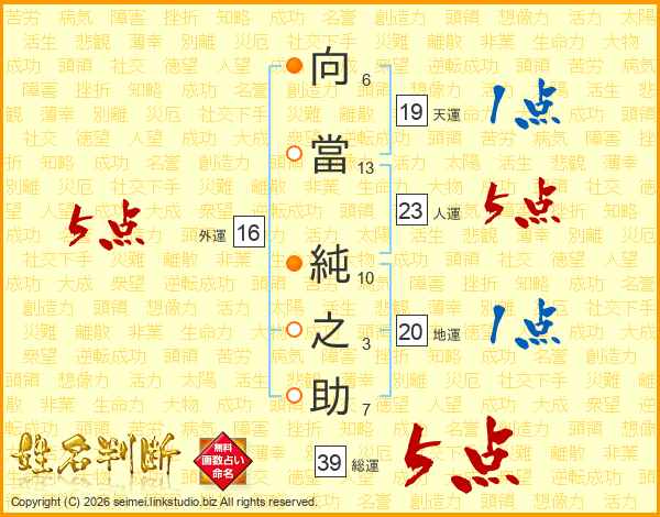 あなたの人生を表す1番重要な運勢です。生涯を通じて影響する総合運となり、主に50歳以降の晩年期に影響を及ぼします。苗字と名前の合計画数。
