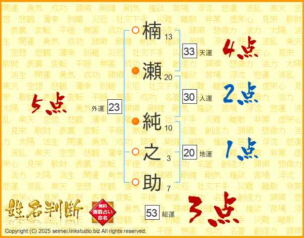 楠(13画)瀬(20画) 純(10画)之(3画)助(7画)